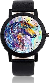 Armbanduhr mit Wasserfarben-Pferd, personalisierbar, leger, schwarzes Lederband, Armbanduhr für Herren und Damen, Unisex