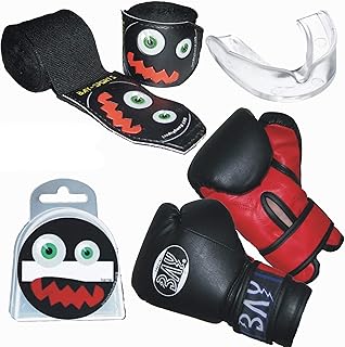SPARSET BAY® monster face 3D - BOXHANDSCHUHE + BOXBANDAGEN + ZAHNSCHUTZ + DOSE - "KIDS JUNIOR basic "2,5" SPEZIELL FÜR KINDER SCHWARZ + WICKELANLEITUNG, elastisch und etwas dünner, 2,5 Meter x 5 cm, Box-Bandagen, Paar Tapes Zahnschutz Mundschutz Zahnschützer Mundschützer mit Dose Box transparent weiß klar farblos