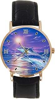 Fantastische springende Delfin und Sonnenuntergang Armbanduhr Mode Klassisch Unisex Analog Quarz Edelstahlgehäuse Lederarmband Uhren