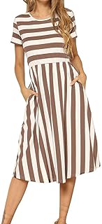 LILIHOT Damenmode Kurzarm Gestreiften Print Taschen Casual Swing Midi-Kleid Sommerkleider Damen V-Ausschnitt Gestreift Kleid ÄRmellos Midikleid Casual Swing Strandkleid