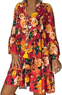 WFRAU Damen Übergröße S-5XL Lange Ärmel Blumendruck V-Ausschnitt Hemdkleid Freizeit Kleider Frau Lose Taste Midi Strand Kleider Frauen Party Kleid Strandkleidung Tanzkleid Hemdkleid Formelle Kleidung